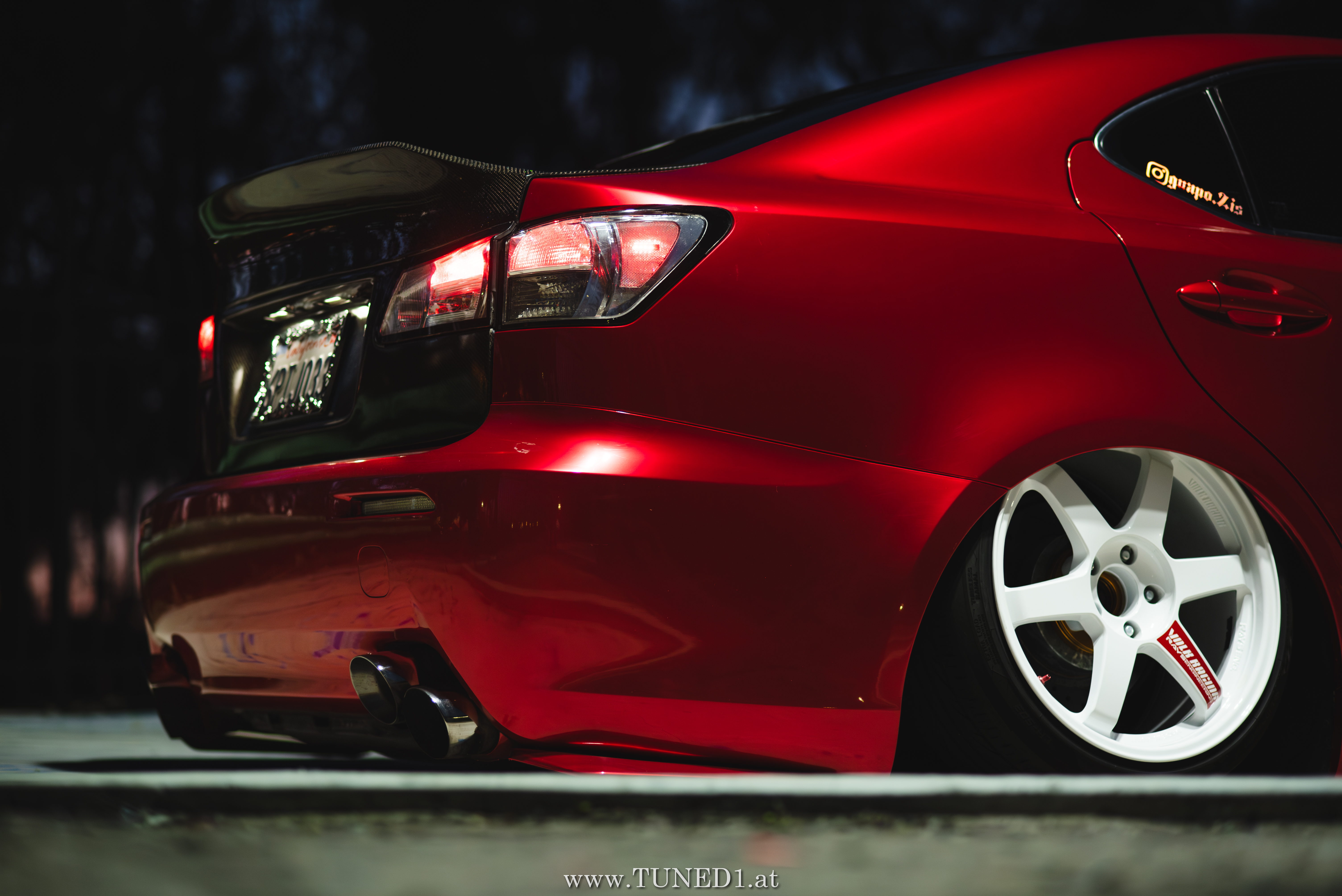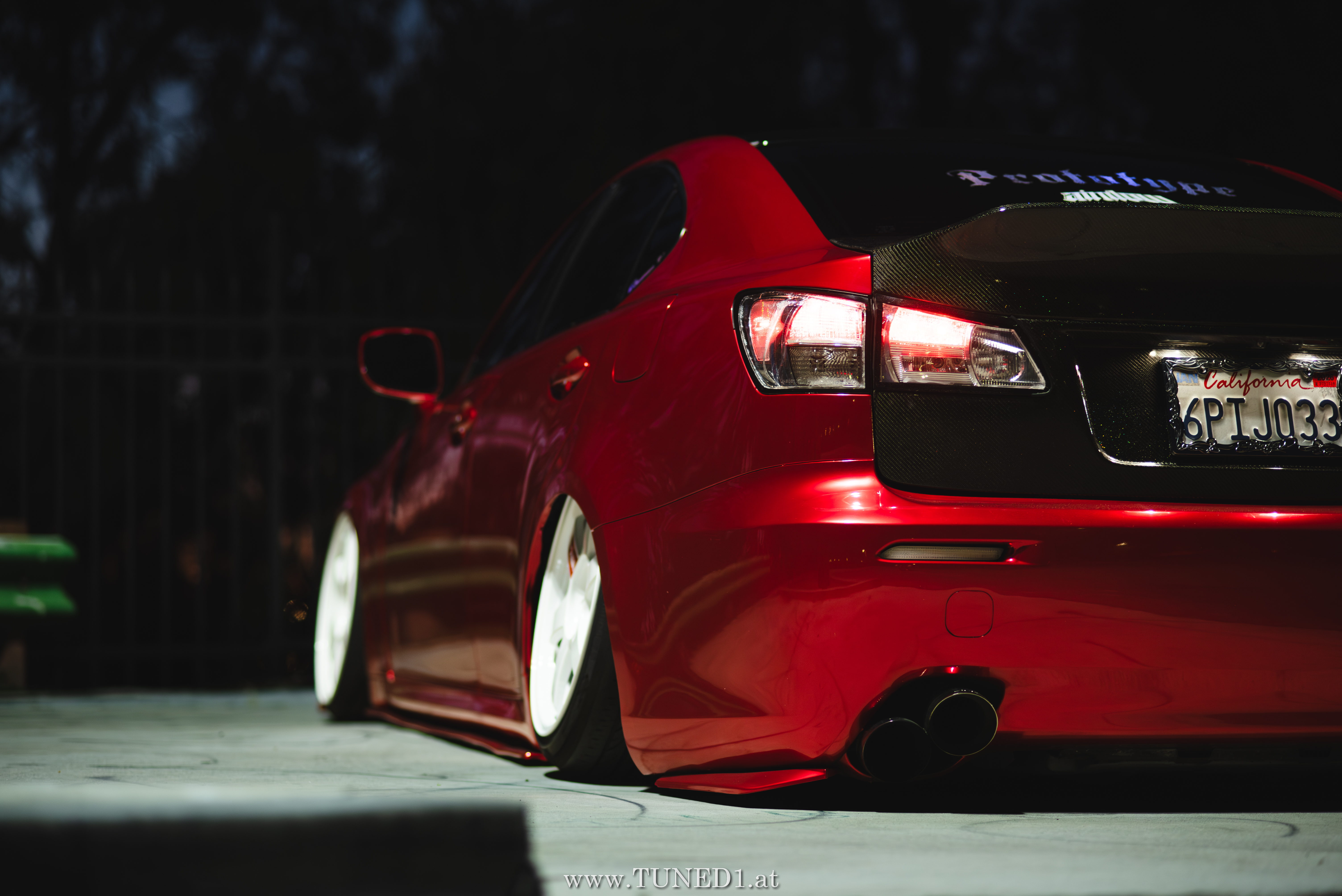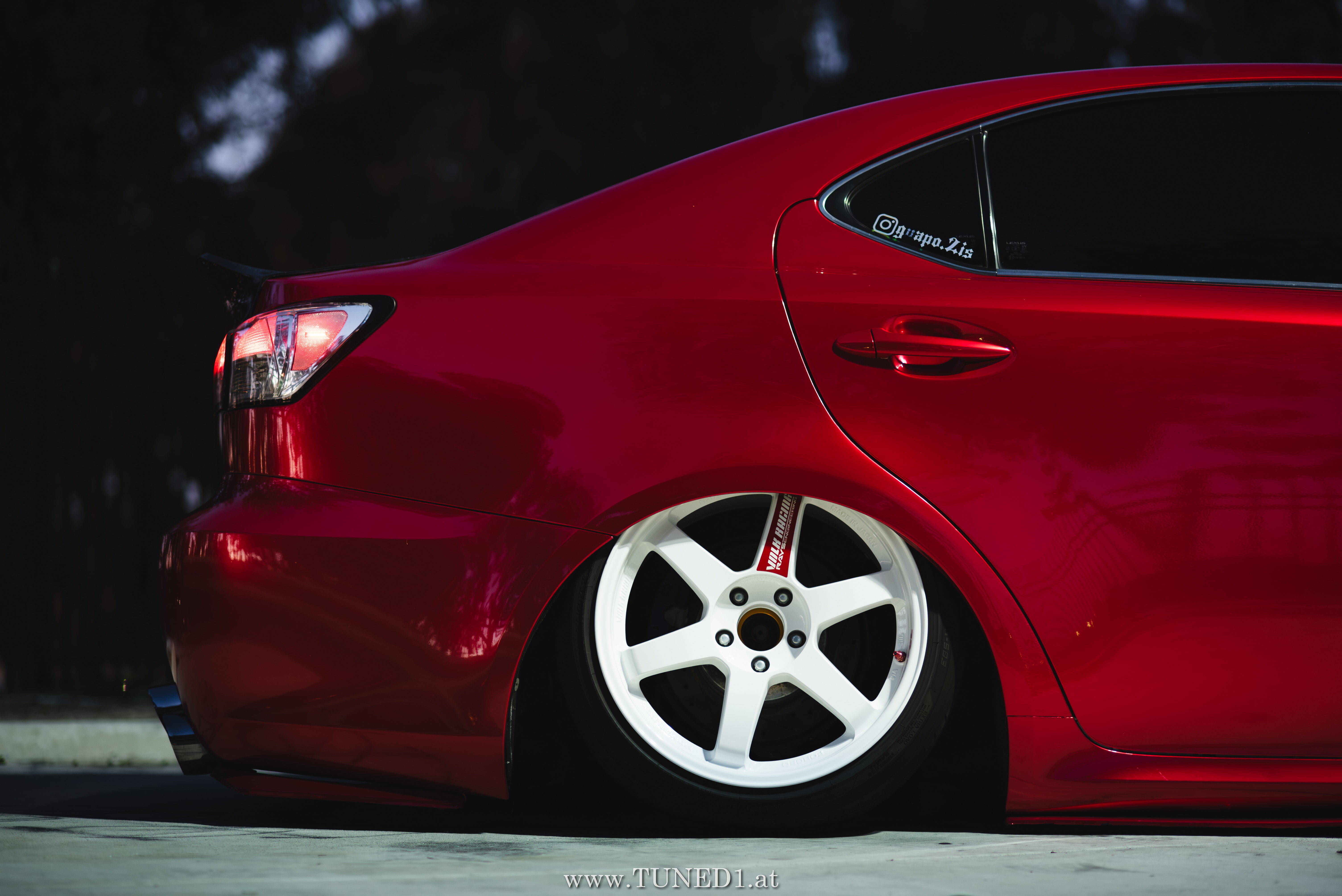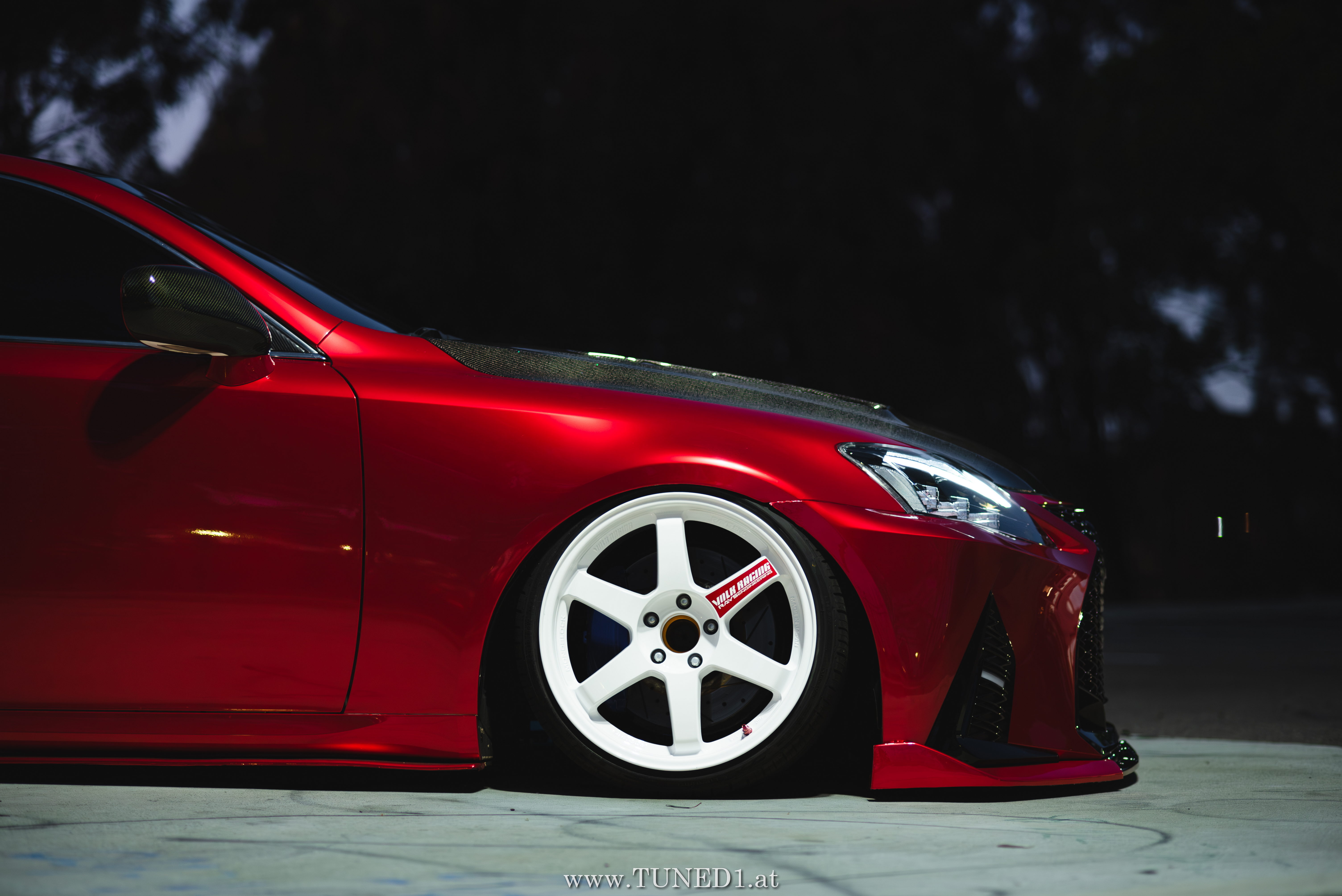 Frontstange vom Nachfolgemodell, LED Scheinwerder und Heckleuchten, Luftfahrwerk, VolkRacing by Rays und rote Perleffekt Folie machen in Kombination mit den Carbonteilen inkl. Glitterlackierung, machen aus dem sonst so schnöden Lexus eine richtig geile Tunerkarre.