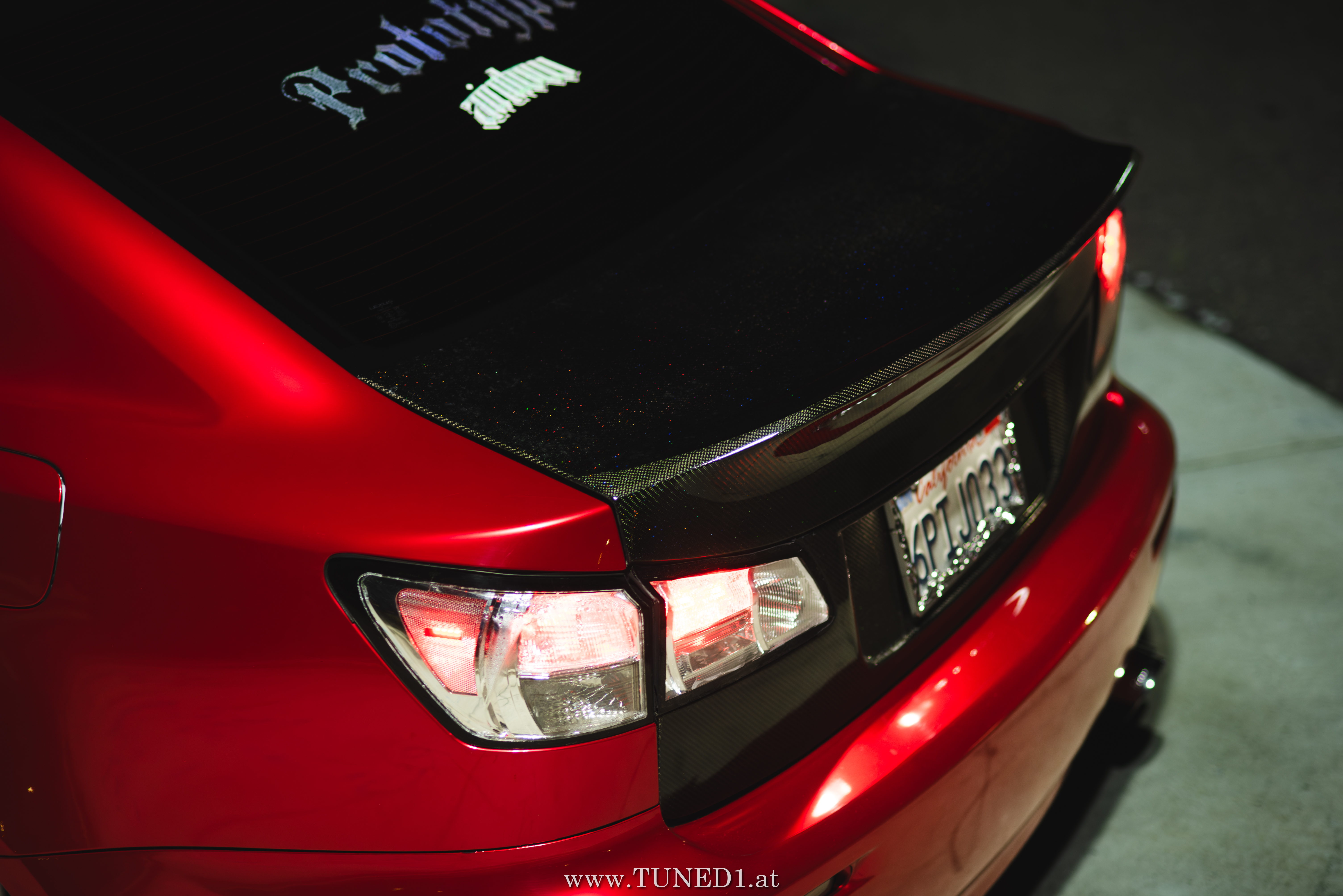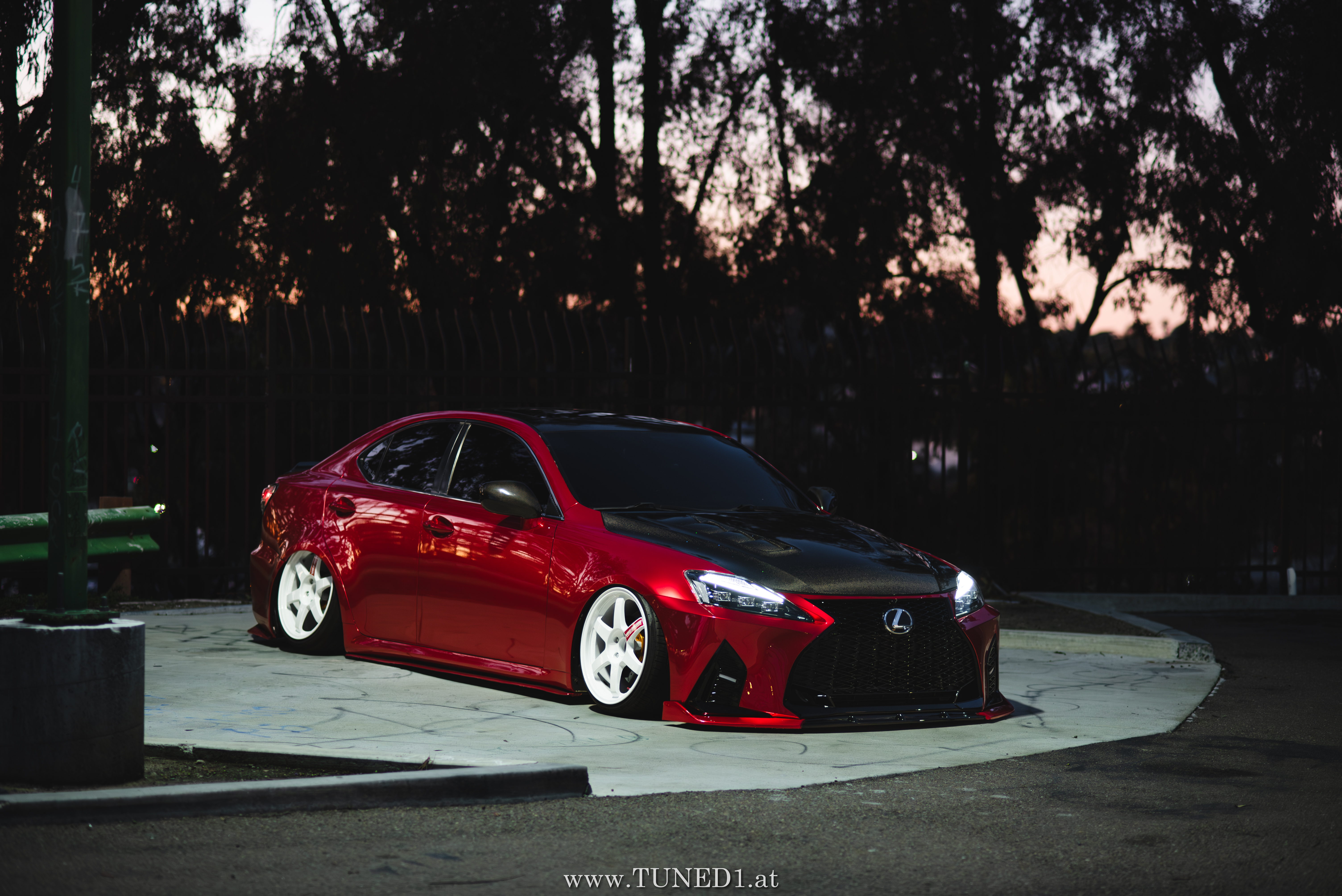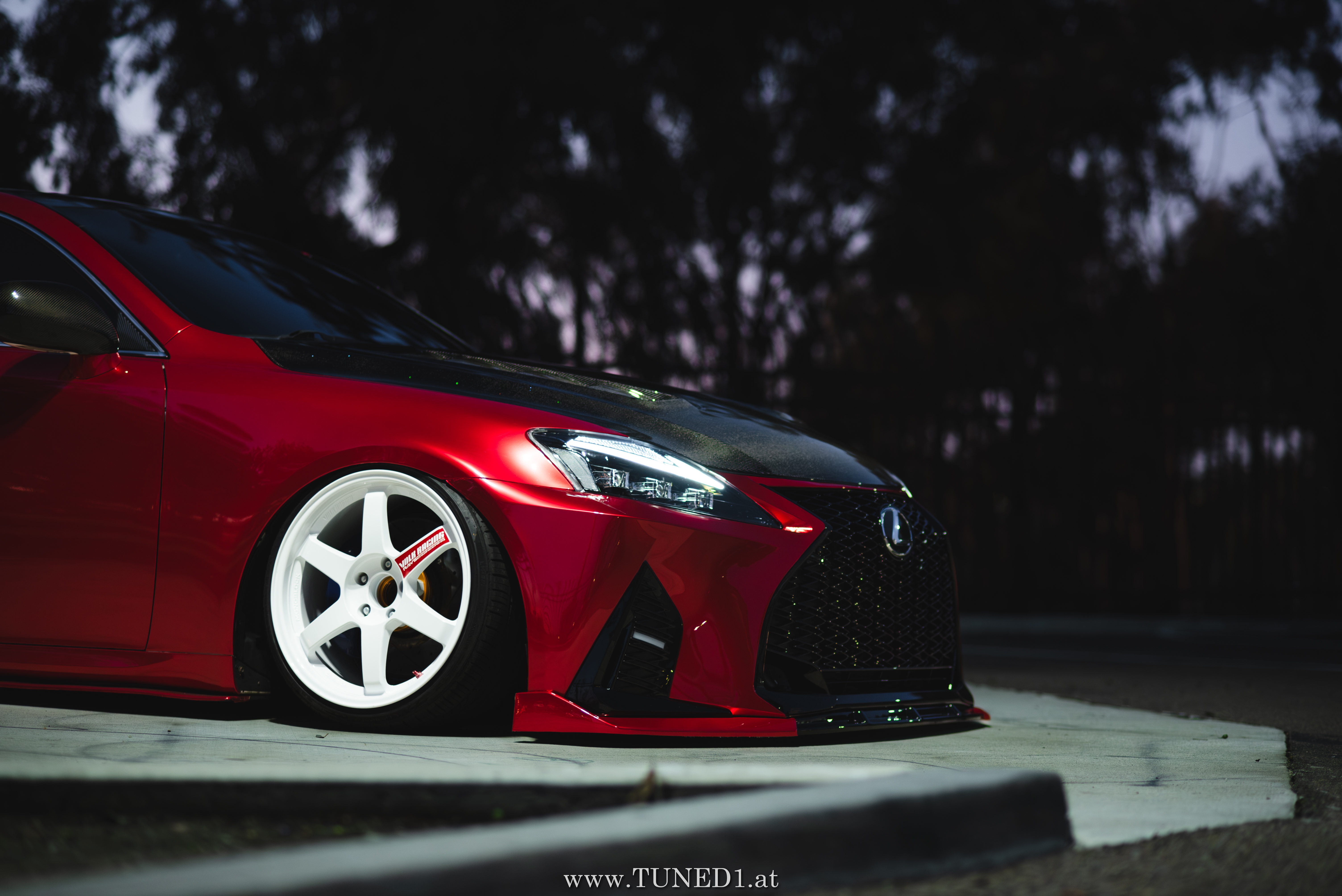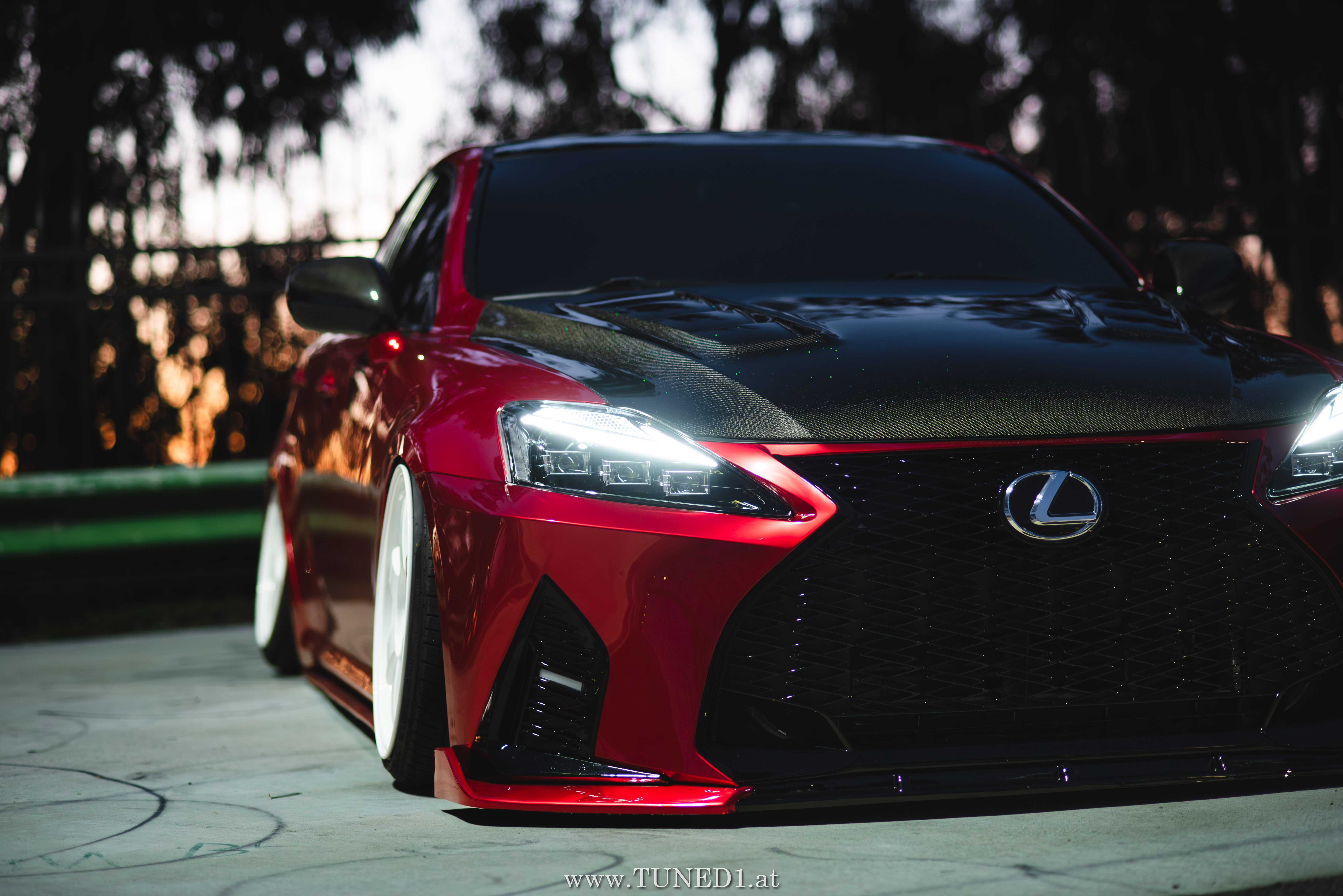 Frontstange vom Nachfolgemodell, LED Scheinwerder und Heckleuchten, Luftfahrwerk, VolkRacing by Rays und rote Perleffekt Folie machen in Kombination mit den Carbonteilen inkl. Glitterlackierung, machen aus dem sonst so schnöden Lexus eine richtig geile Tunerkarre.