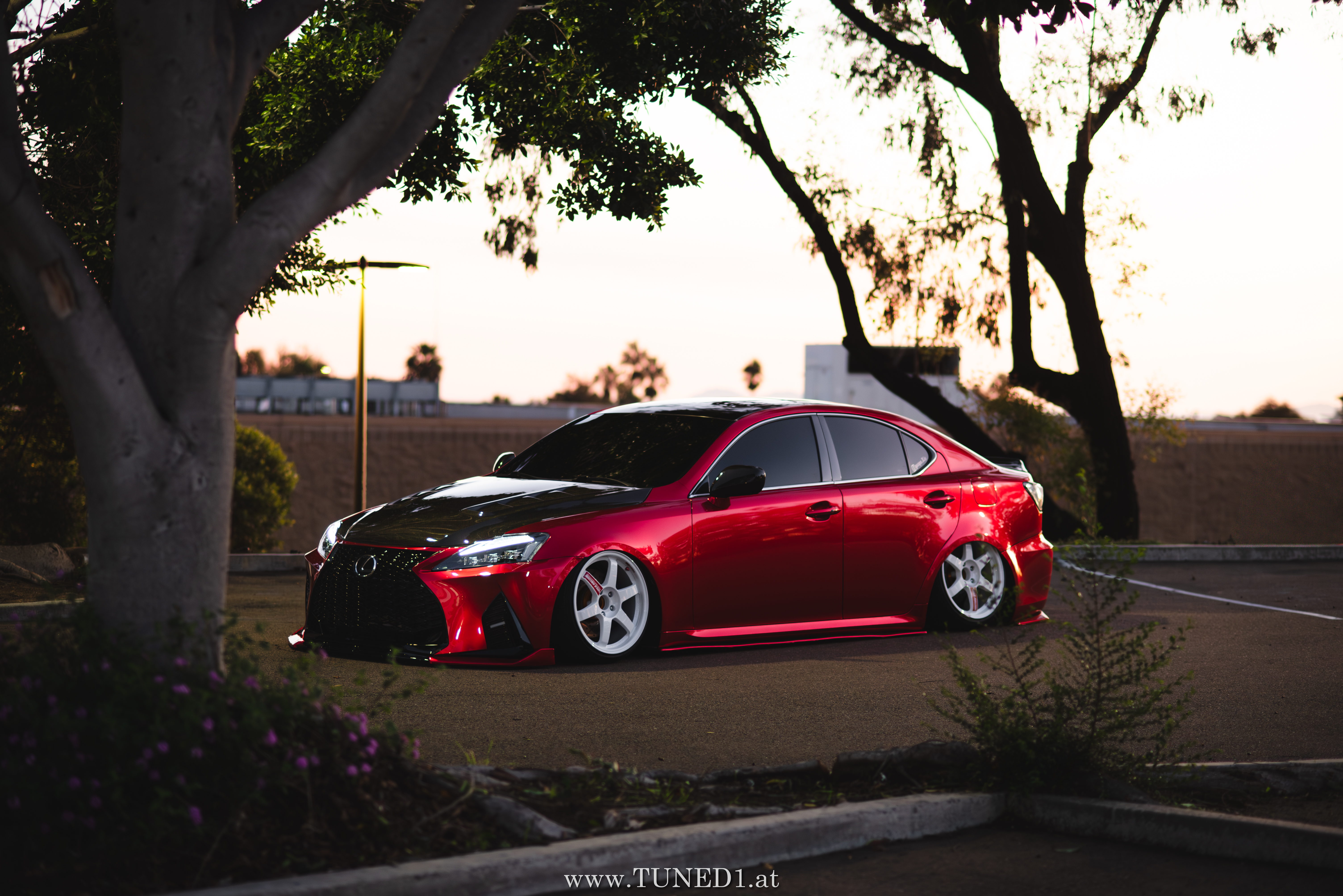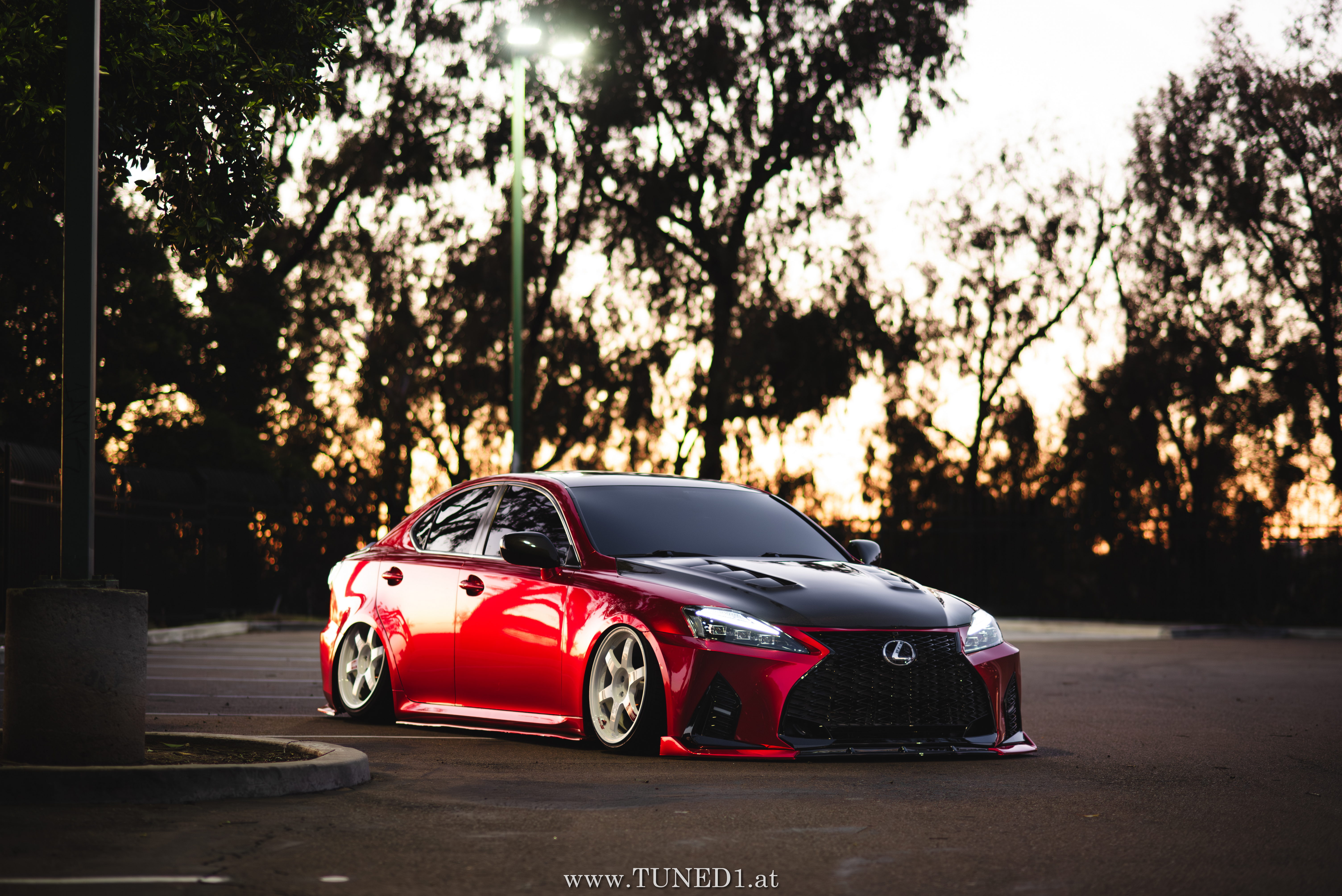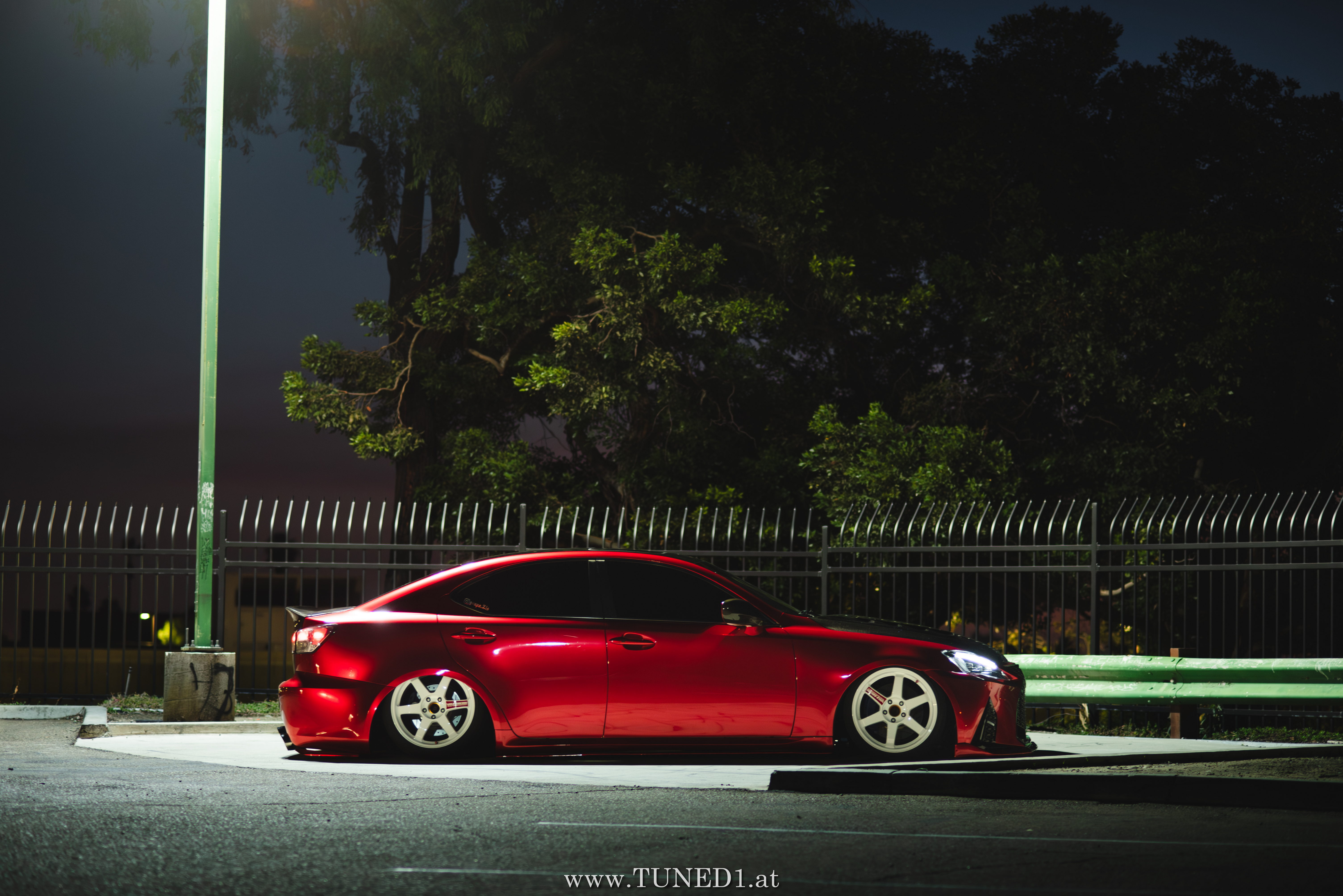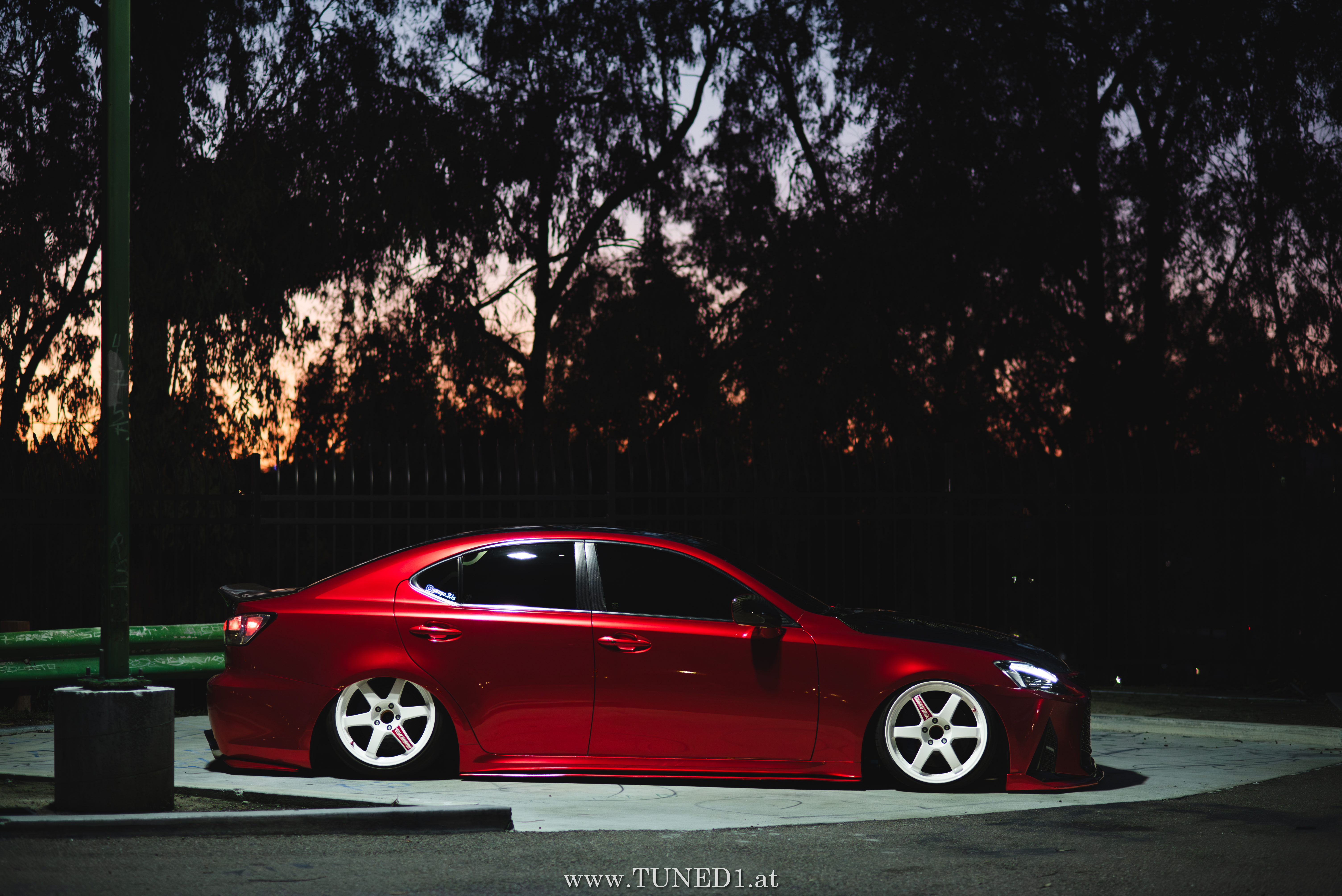 Frontstange vom Nachfolgemodell, LED Scheinwerder und Heckleuchten, Luftfahrwerk, VolkRacing by Rays und rote Perleffekt Folie machen in Kombination mit den Carbonteilen inkl. Glitterlackierung, machen aus dem sonst so schnöden Lexus eine richtig geile Tunerkarre.